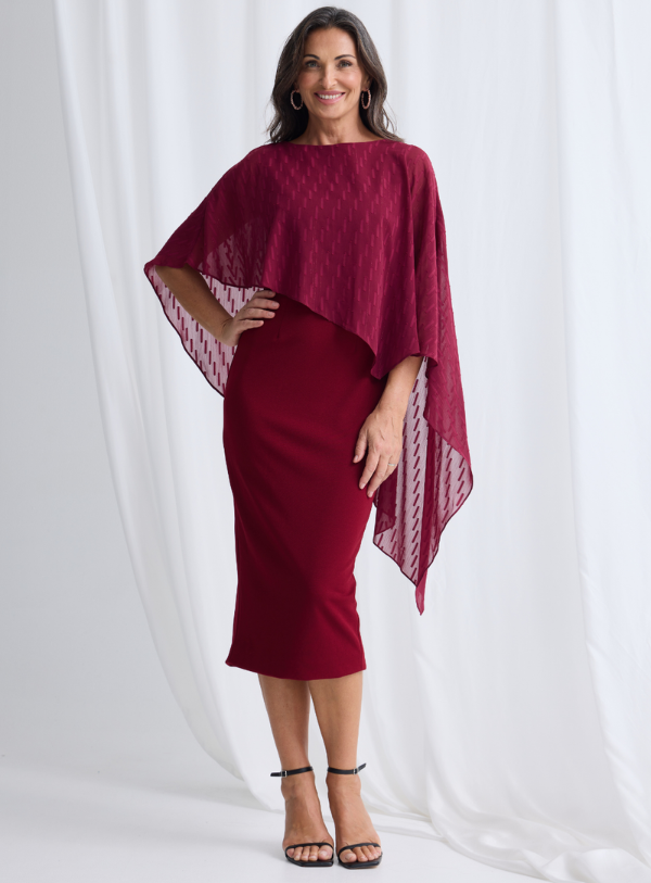 This gorgeous cocktail dress features a asymmetrical chiffon overlay with metallic thread, over a stretch, crepe dress that hugs the right spots while providing a comfortable glamour.