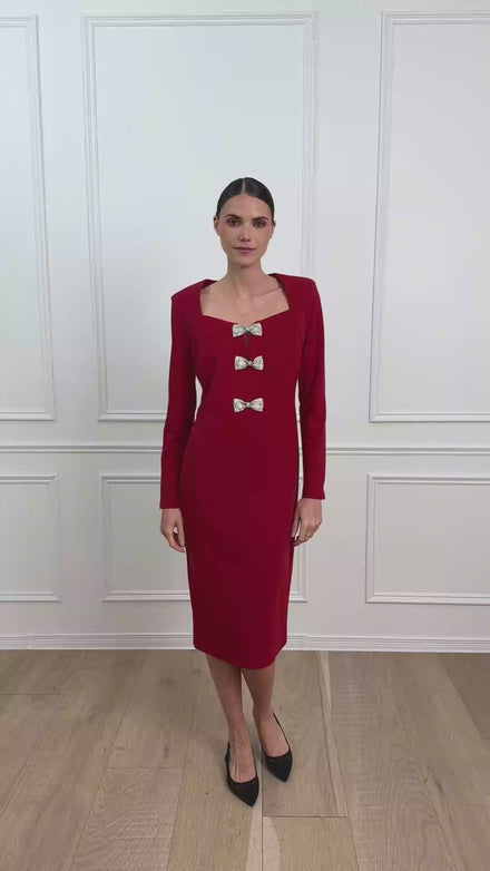 An elegant scuba crepe dress with a bold square neckline that complements the classic sheath silhouette. A chic rhinestone bow detail at the centre front of the bodice gives a dramatic flair to this contemporary design.