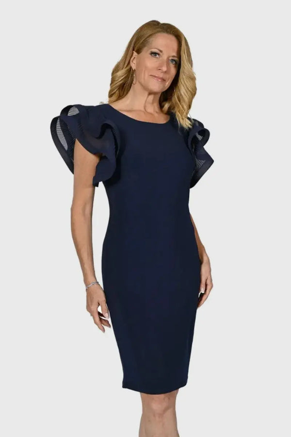 This Frank Lyman Ruffle Sleeve Dress is a versatile, stylish piece that adds a touch of sophistication to any wardrobe. Offering exceptional comfort and a flattering fit, this chic feminine dress is perfect for day or evening wear.