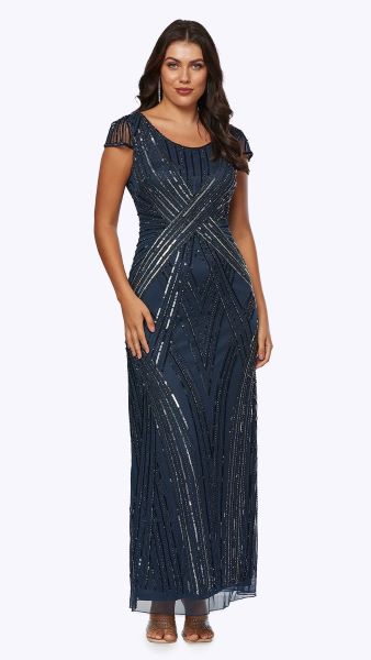 Make a statement in this gorgeous sequin gown, full length with cap sleeves, it features intricate detailing and a stunning cross over pattern that cinches the waist and creates a flattering silhouette.