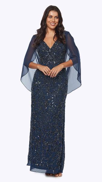 This stunning full length dress by Jesse Harper, features a flatter v-neck and gorgeous beaded embellishments with chiffon cape overlay.