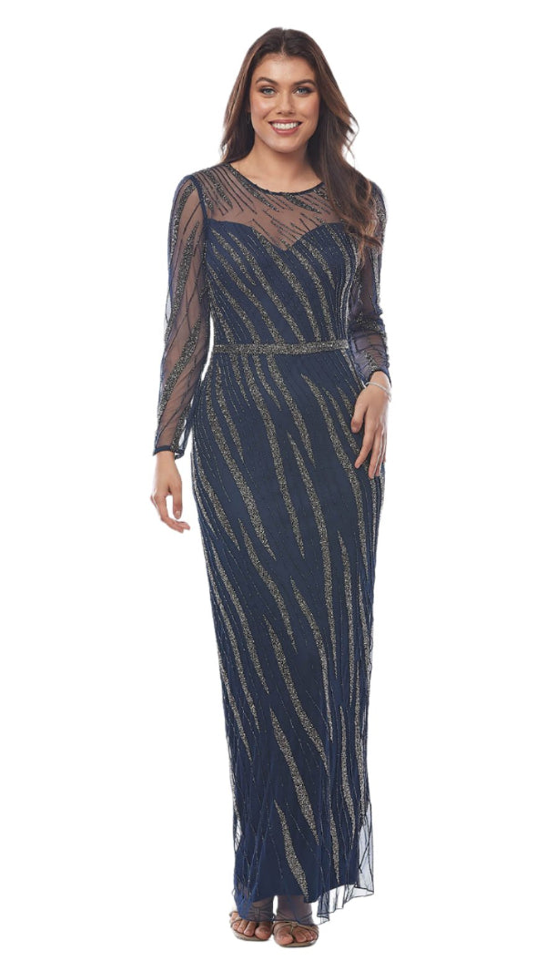 This stunning long-sleeved gown comes in a navy with beaded diagonal design to flatter all shapes and sizes.
