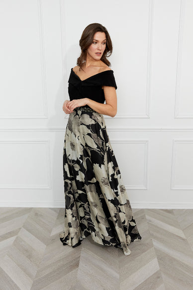 A glamorous off shoulder Frank Lyman A-line maxi dress. A beautiful floral printed skirt that falls to the floor with inverted pockets for that added touch of femininity and grace. And an alluring off shoulder cross over bodice to dazzle & capture attention.