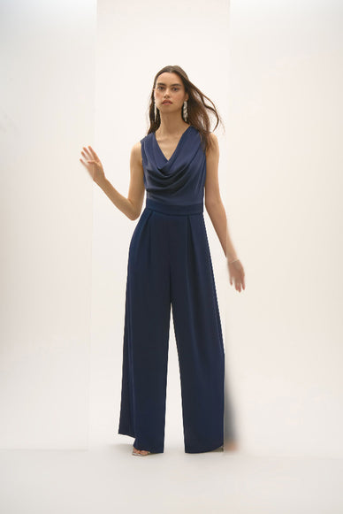 A graceful satin cowl neck elevates this sleeveless crepe jumpsuit, which showcases an effortlessly elegant wide-leg silhouette. Delicate pleating at the shoulder and waist adds refined detail to this chic piece, while a discrete back zipper ensures ease of wear. This versatile garment seamlessly blends sophistication with comfort, making it perfect for both day and evening occasions. Part of the Joseph Ribkoff Signature collection.