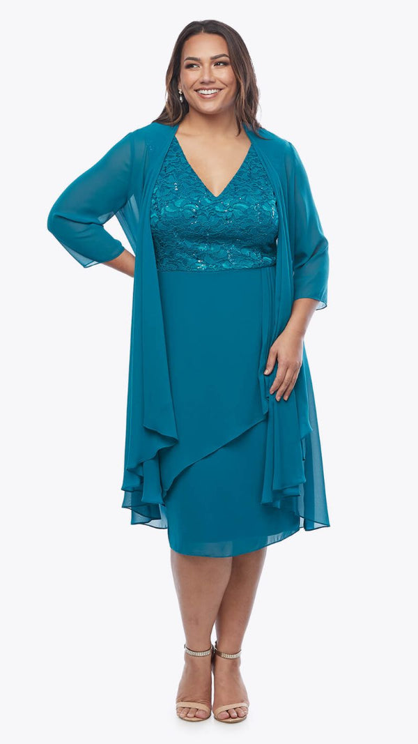 This gorgeous embellished chiffon dress features a sequin lace bodice with a waterfall skirt from the waist and a longline jacket that will flatter all sizes.